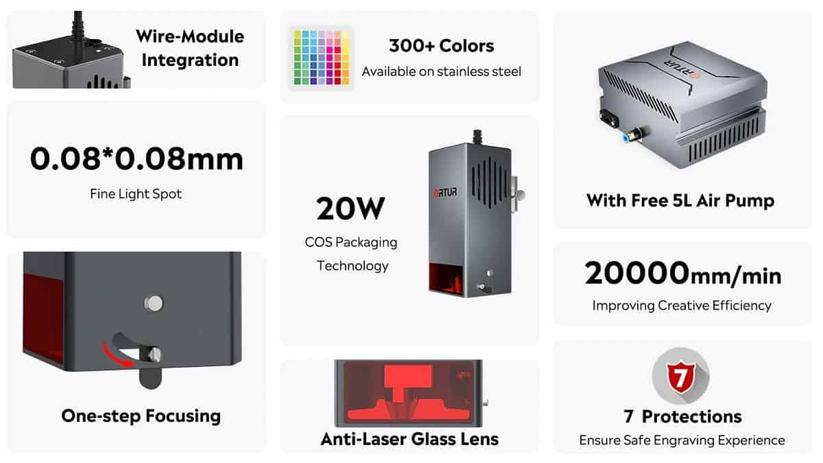 Dahili hava desteği, daha iyi gravür ve kesim sonuçları için bir başka nimettir. Ortur LU3-20A ayrıca paslanmaz çelik üzerinde 256 çeşit gri tonlamalı gravür ve 340’tan fazla renkli gravür seçeneği elde edebilir. Lazer kazıyıcı, yerleşik web kullanıcı arabirimi, sürücü ve yazılım gerektirmemesi veya statik haritayı Gcode’a dönüştürmeye gerek kalmadan fotoğrafların doğrudan kazınması ile daha kullanıcı dostudur. Yedi ana güvenlik garantisi sizin güvenliğinizle de ilgileniyor. Ama bu buzdağının sadece görünen kısmı. Bu lazer kazıma makinesi hakkında daha fazla bilgiyi şu adreste keşfedin: resmi internet sitesi.
